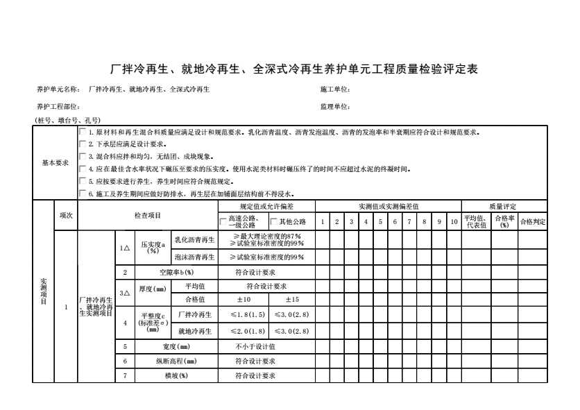 表格名称:厂拌冷再生、就地冷再生、全深式冷再生养护单元工程质量检验评定表