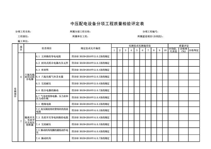 表9.18.2 中压配电设备分项工程质量检验评定表