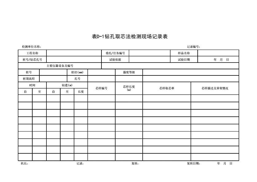 表格名称:表D-1 钻孔取芯法检测现场记录表