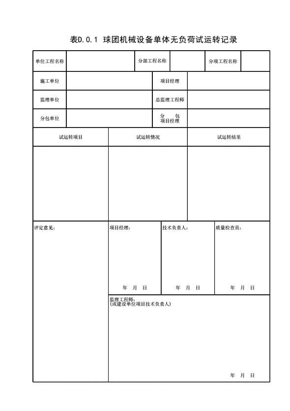 表格名称:D.0.1 球团机械设备单体无负荷试运转记录