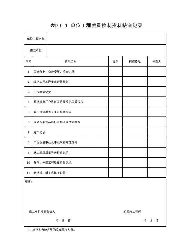 表D.0.1 单位工程质量控制资料核查记录