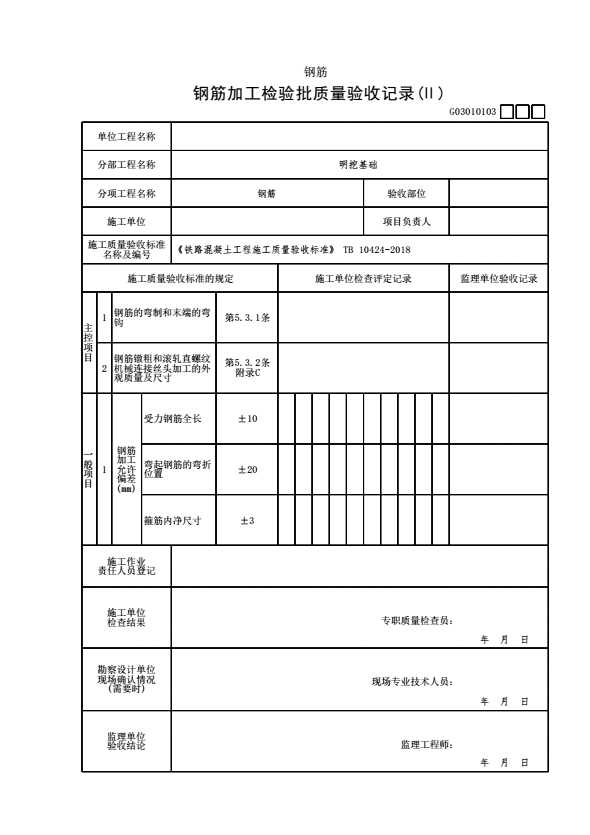 表格名称:G03010103 【钢筋】钢筋加工检验批质量验收记录(Ⅱ)