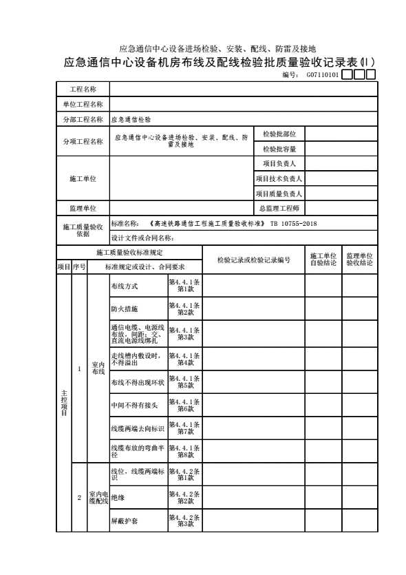 表格名称:G07110101 【应急通信中心设备进场检验、安装、配线、防雷及接地】应急通信中心设备机房布线及配线检验批质量验收记录表(Ⅱ)