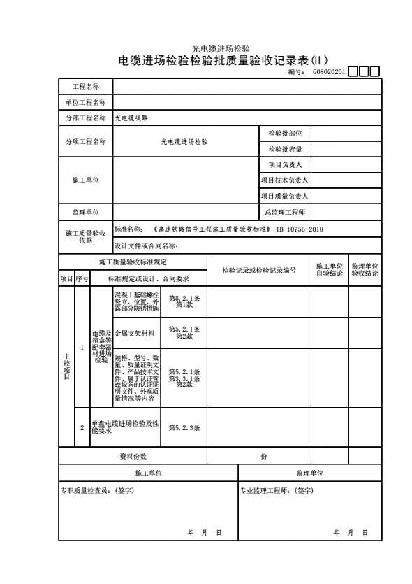 表格名称:G08020201 【光电缆进场检验】电缆进场检验检验批质量验收记录表(Ⅱ)