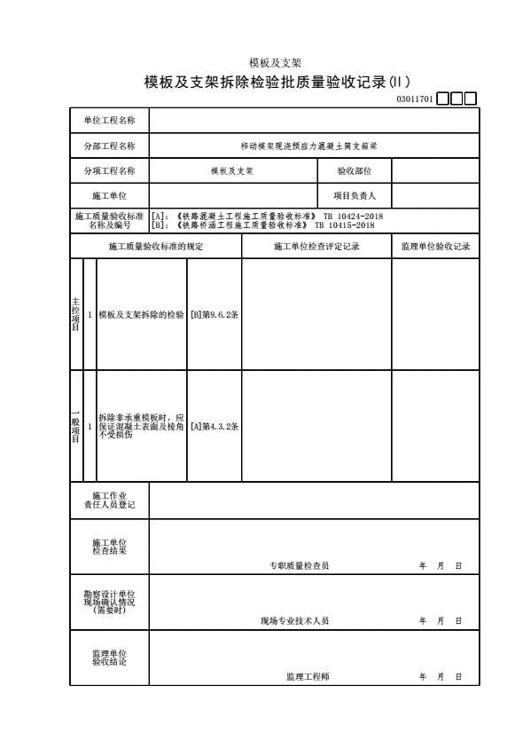 表格名称:03011701 模板及支架拆除检验批质量验收记录(Ⅱ)