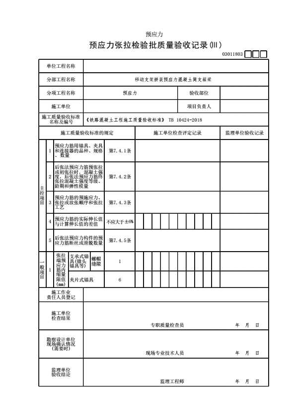 表格名称:03011803 预应力张拉检验批质量验收记录(Ⅲ)