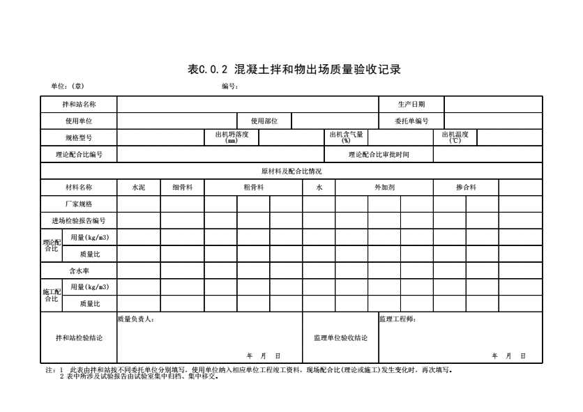 表格名称:表C.0.2 混凝土拌和物出场质量验收记录