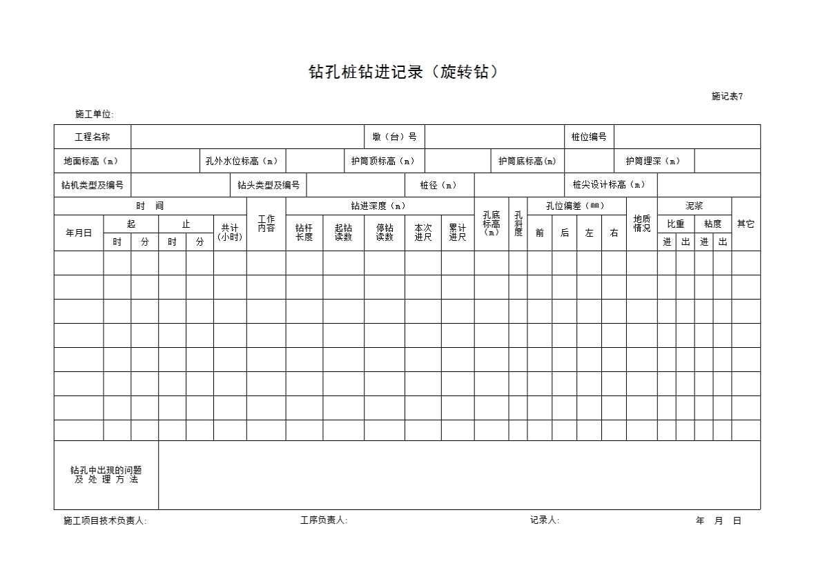 施记表7 钻孔桩钻进记录(旋转钻)