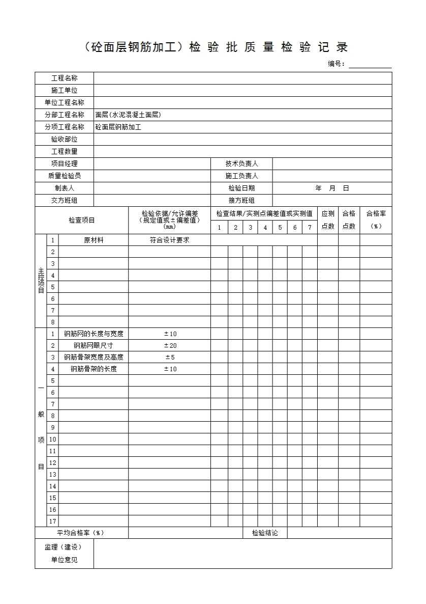 表格名称:10-4-3-1 (砼面层钢筋加工)检验批质量检验记录