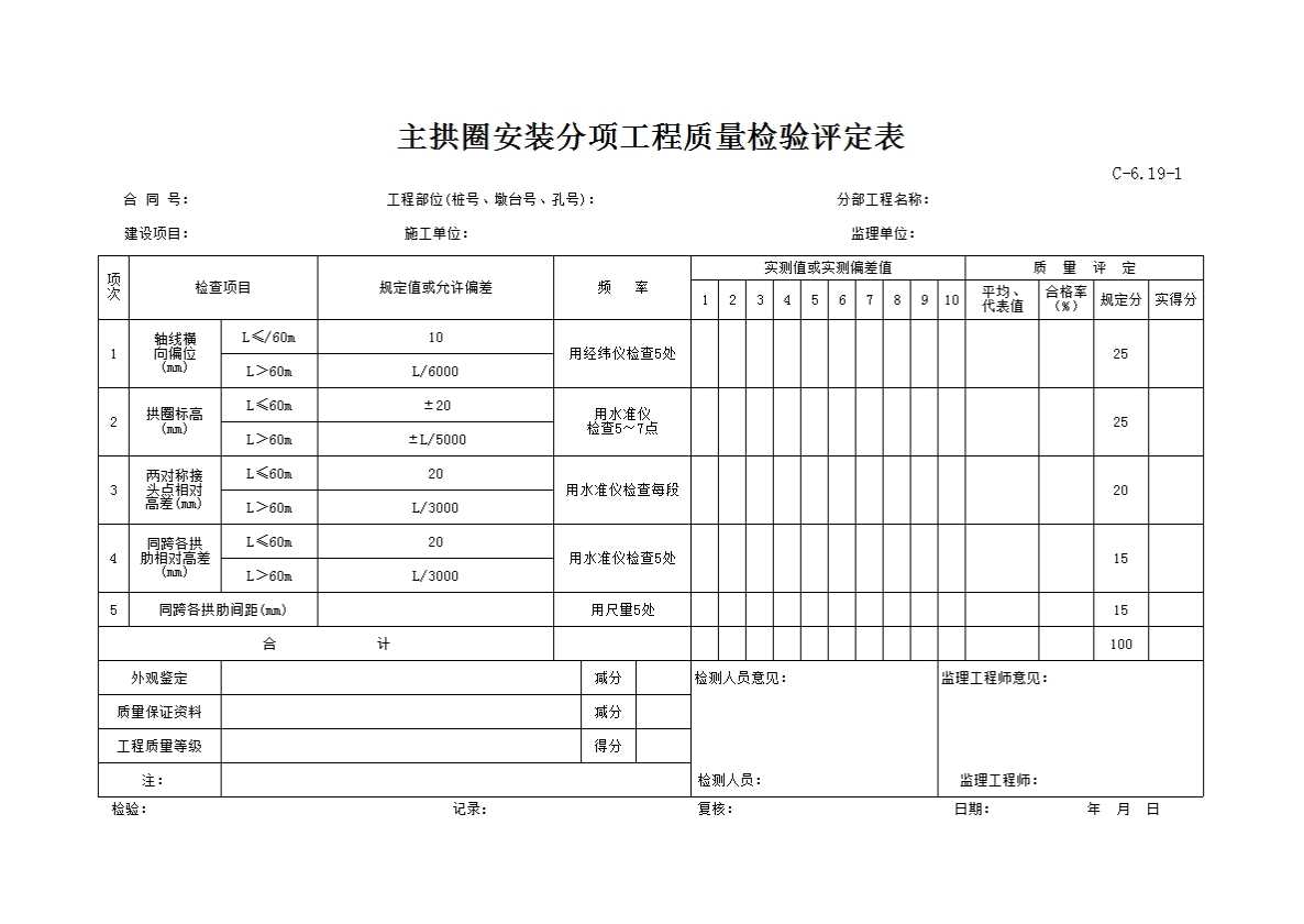 表格名称:249 C-6.19-1 主拱圈安装评定表