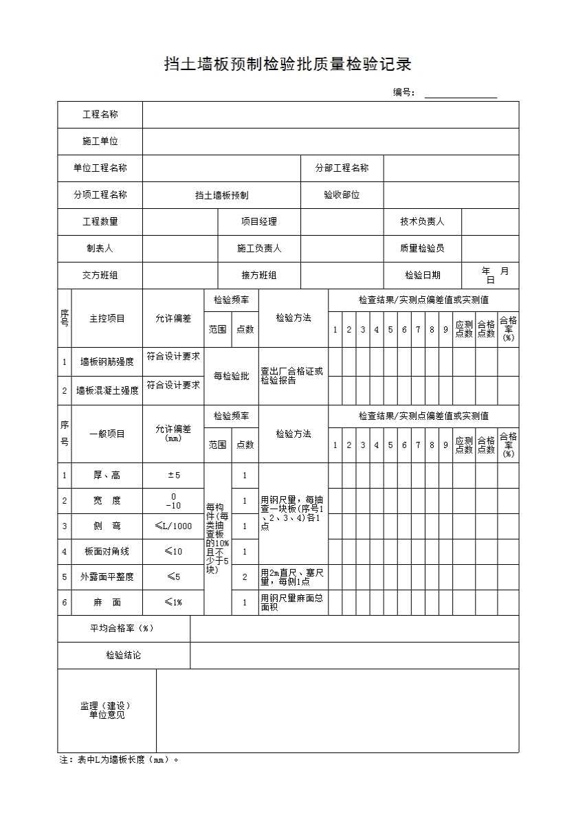 表格名称:挡土墙板预制检验批质量检验记录