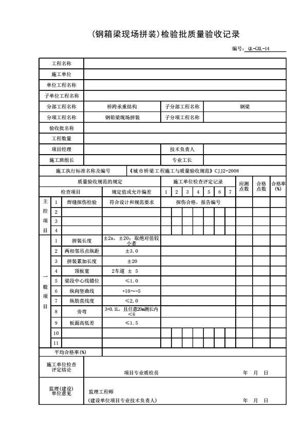 表格名称:(钢箱梁现场拼装)检验批质量验收记录