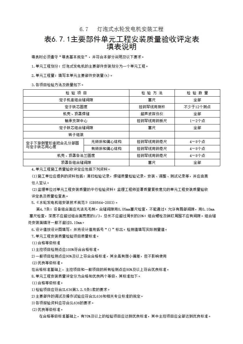 表6.7.1 主要部件单元工程安装质量验收评定表