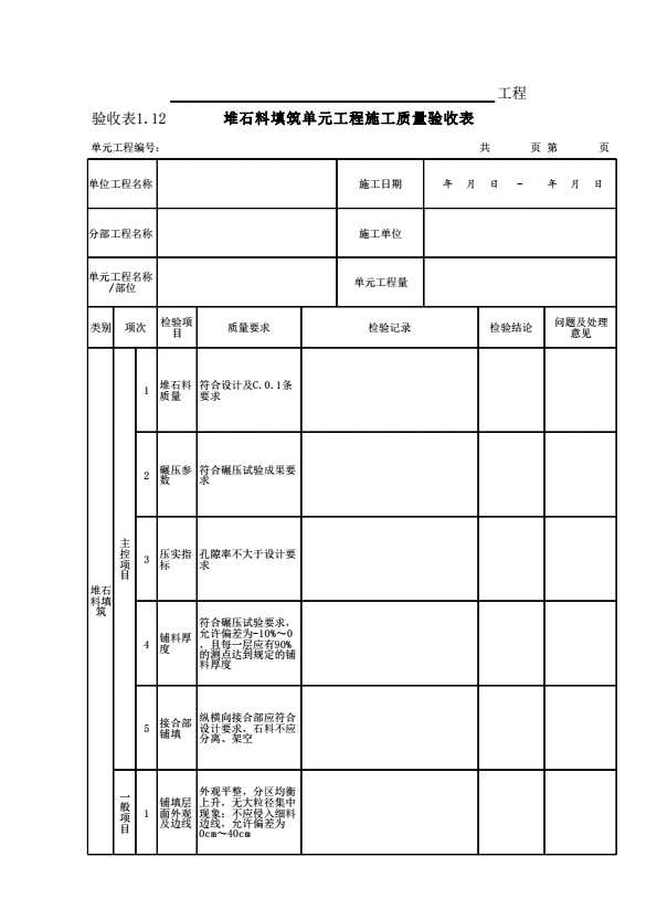 表格名称:表1.12 堆石料填筑单元工程施工质量验收表