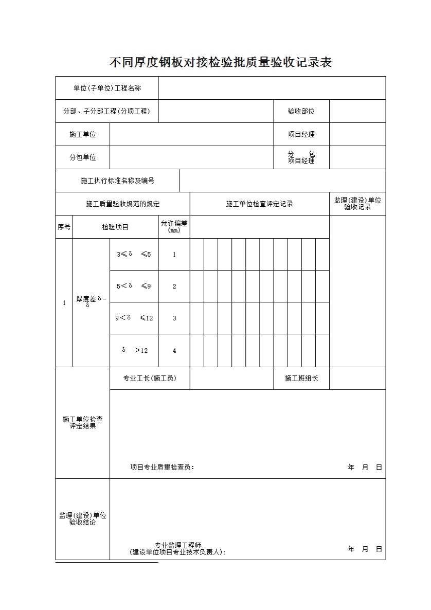 表格名称:不同厚度钢板对接检验批质量验收记录表