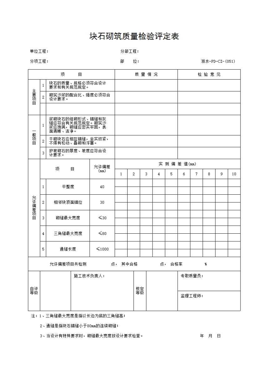 表格名称:051 块石砌筑质量检验评定表