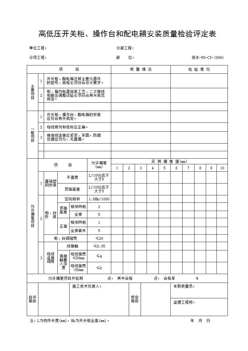 表格名称:096 高低压开关柜、操作台和配电箱安装质量检验评定表