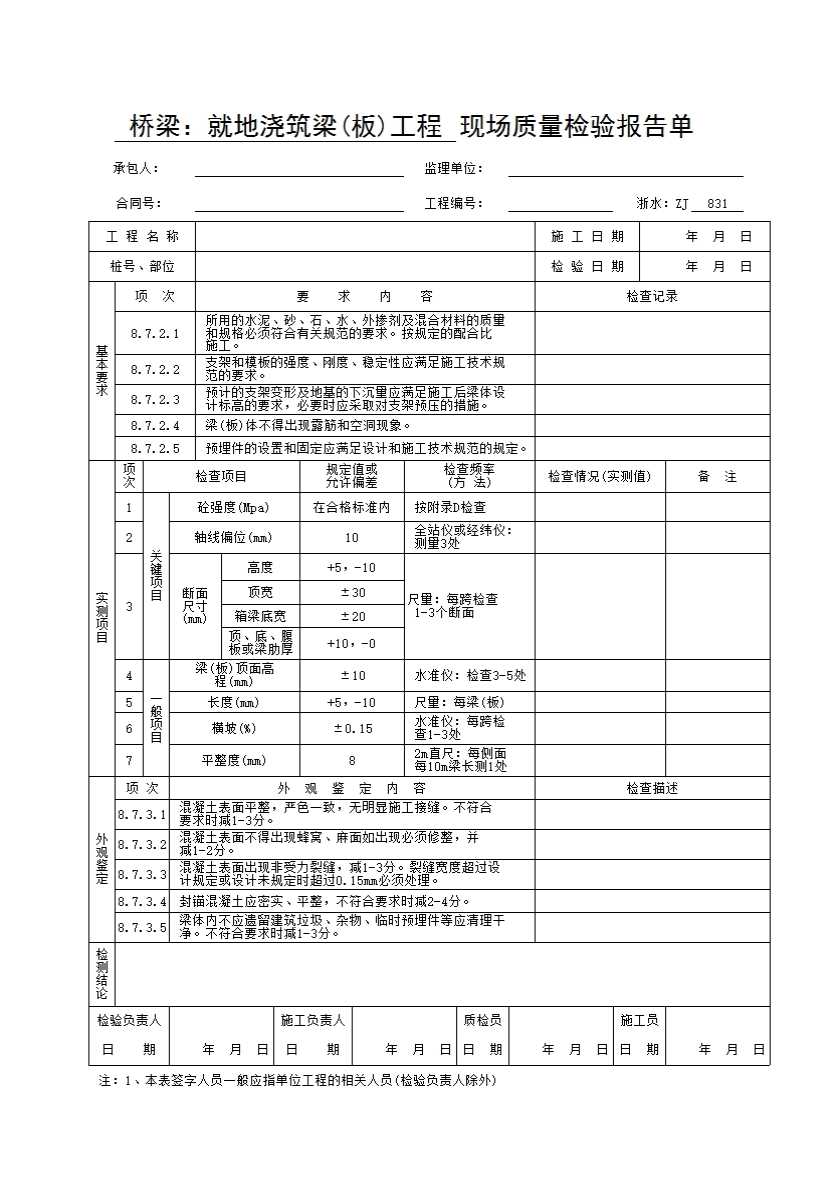 表格名称:浙水:ZJ831 桥梁:就地浇筑梁(板)工程现场质量检验报告单