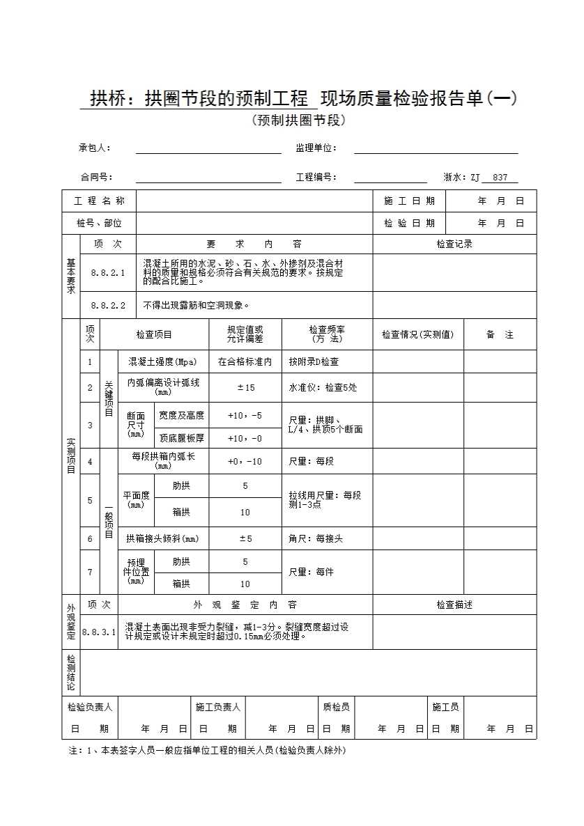 表格名称:浙水:ZJ837 拱桥:拱圈节段的预制工程现场质量检验报告单(一)