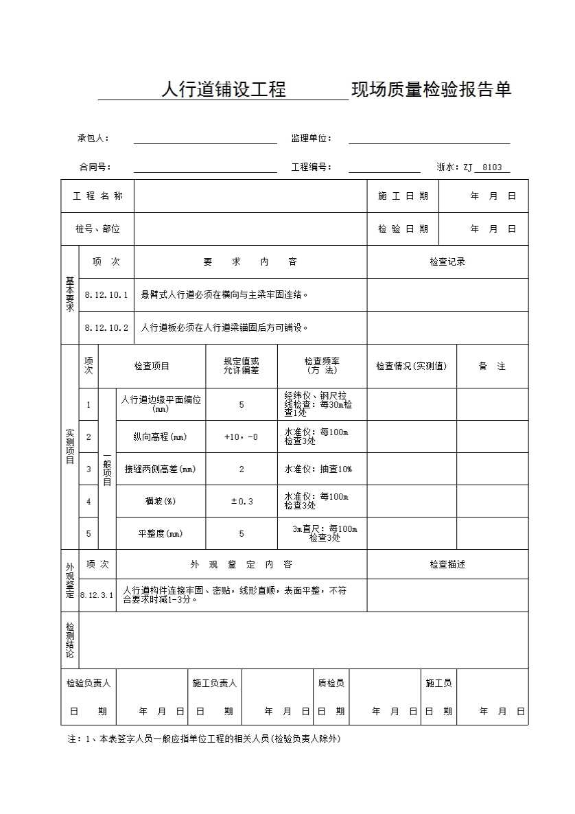 浙水:ZJ8103 人行道铺设工程现场质量检验报告单