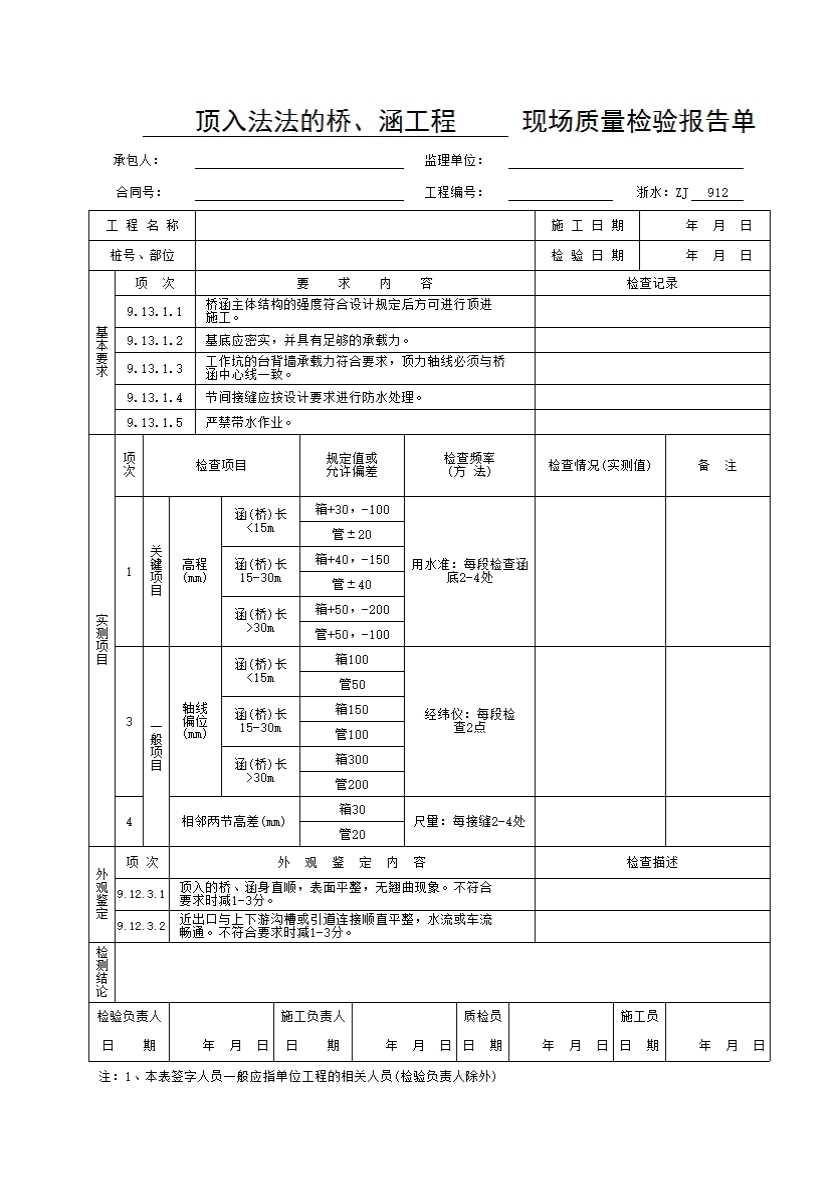 表格名称:浙水:ZJ912 顶入法法的桥、涵工程现场质量检验报告单