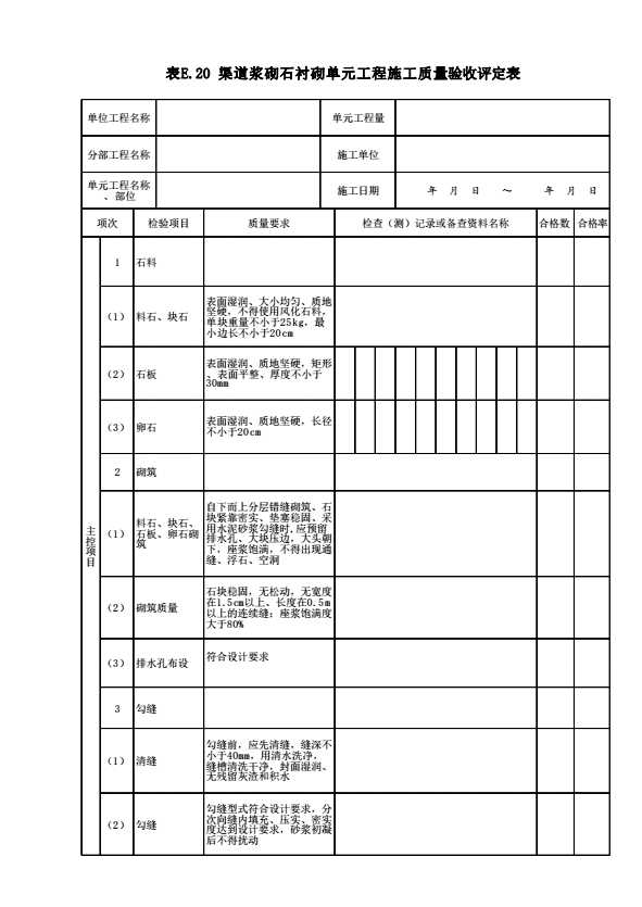 表E.19、表E.20 渠道浆砌石衬砌单元工程施工质量验收评定表及报验单