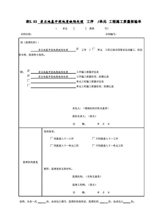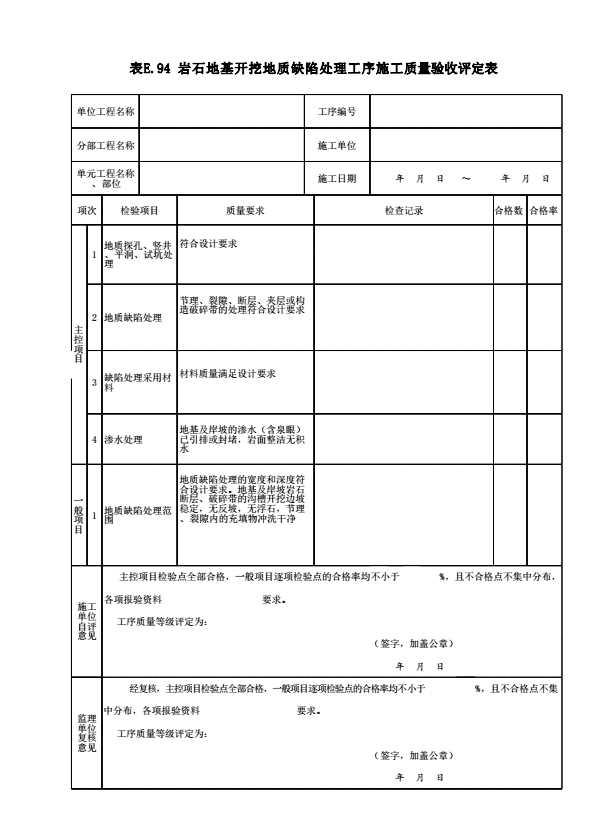 表E.93、表E.94 岩石地基开挖地质缺陷处理工序施工质量验收评定表及报验单