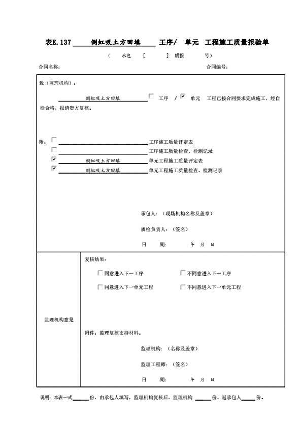 表格名称:表E.137、表E.138 倒虹吸土方回填单元工程施工质量验收评定表及报验单