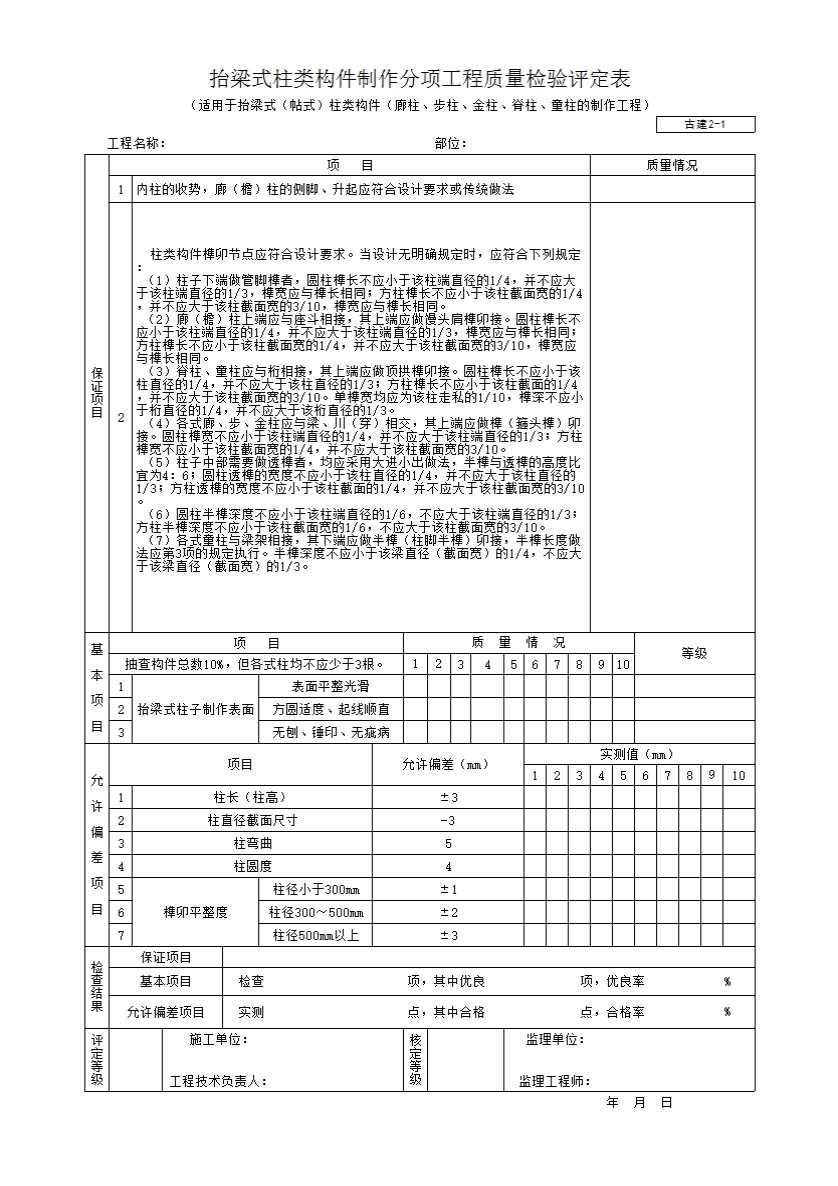 表格名称:抬梁式柱类构件制作分项工程质量检验评定表