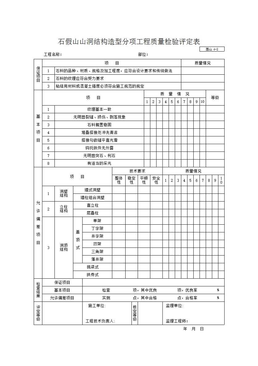 表格名称:石假山山洞结构造型分项工程质量检验评定表