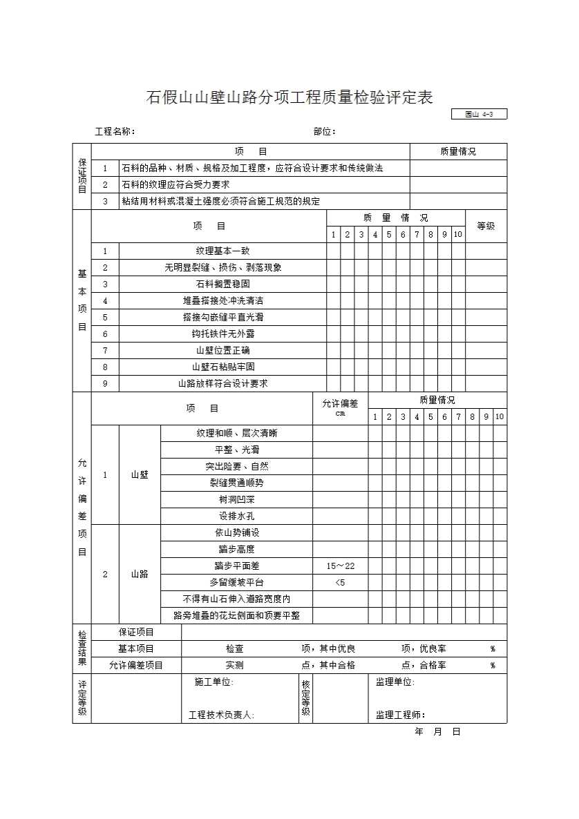 表格名称:石假山山壁山路分项工程质量检验评定表