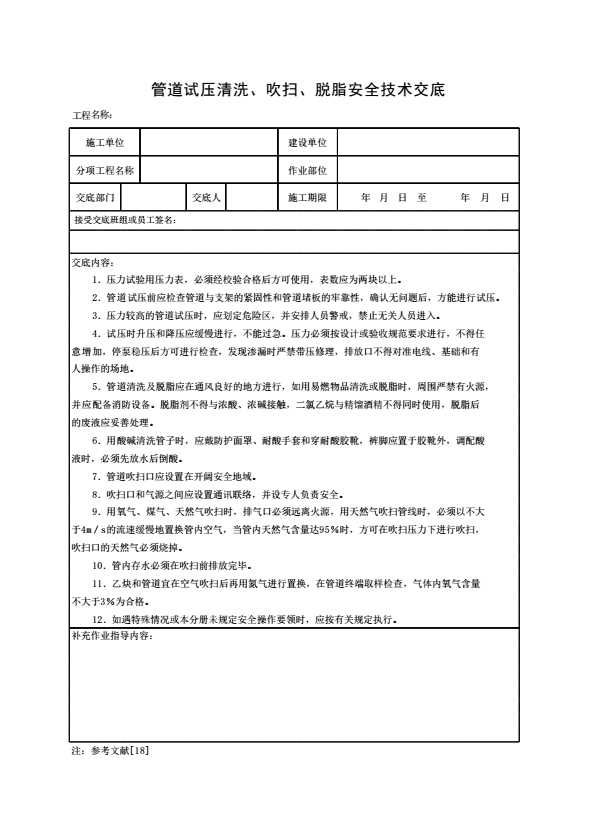 表格名称:管道试压清洗、吹扫、脱脂安全技术交底