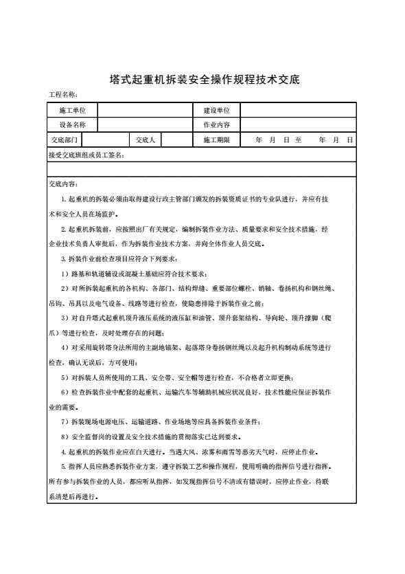 表格名称:塔式起重机拆装安全操作规程技术交底