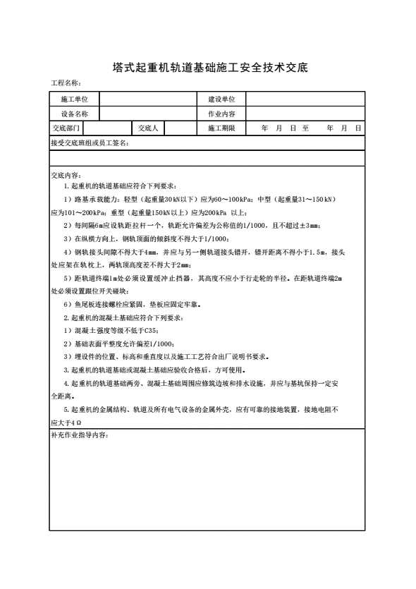 表格名称:塔式起重机轨道基础施工安全技术交底