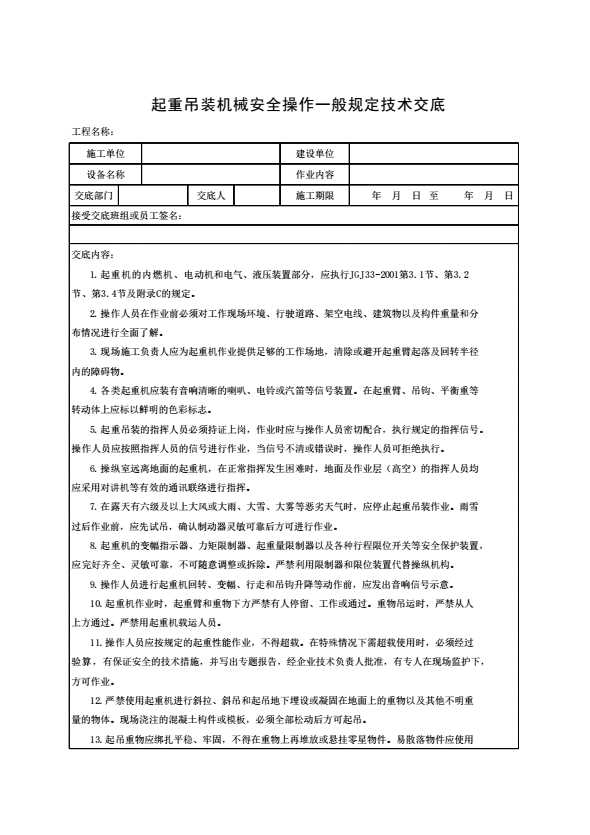表格名称:起重吊装机安全操作一般规定技术交底