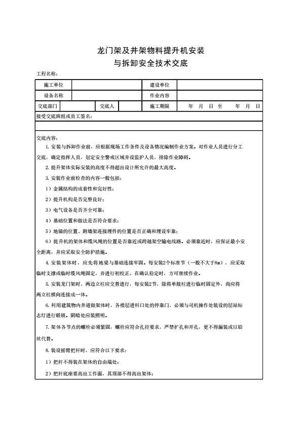 表格名称:龙门架及井架物料提升机安装与拆卸安全技术交底