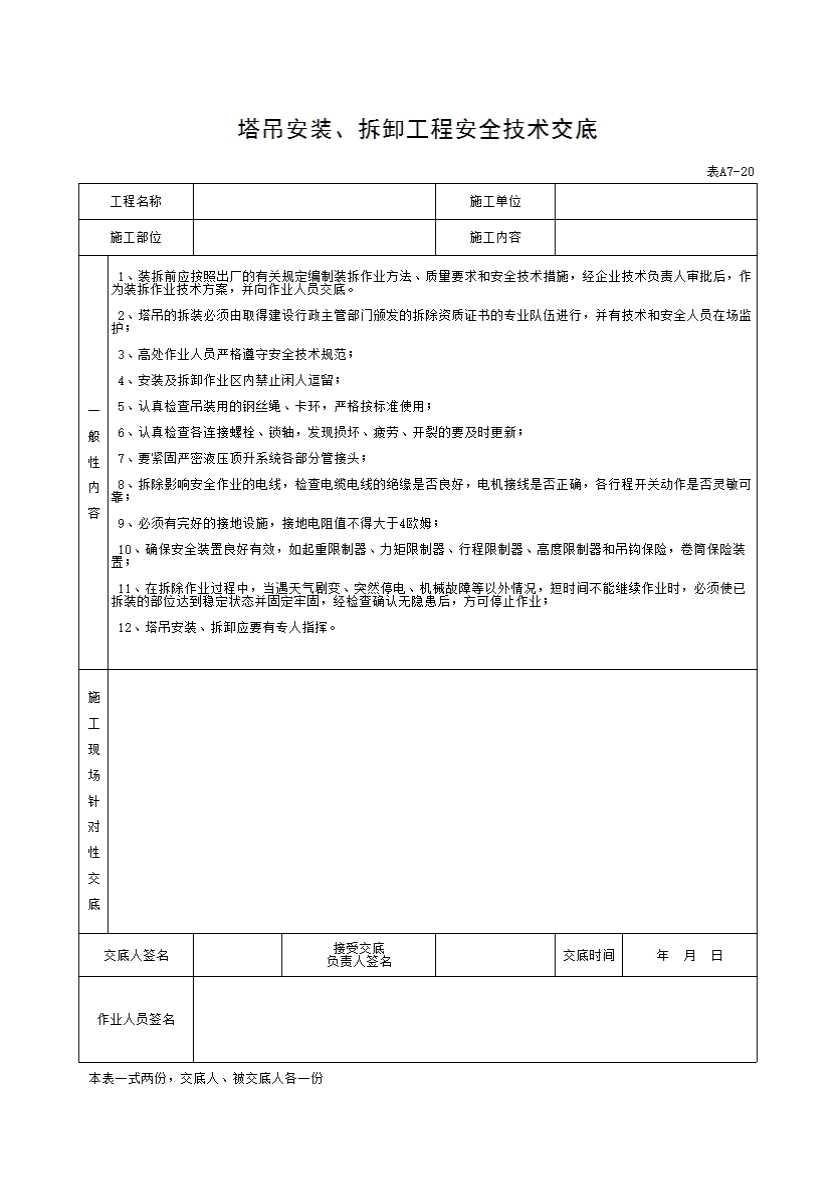 表格名称:表A7-20 塔吊安装、拆卸工程安全技术交底