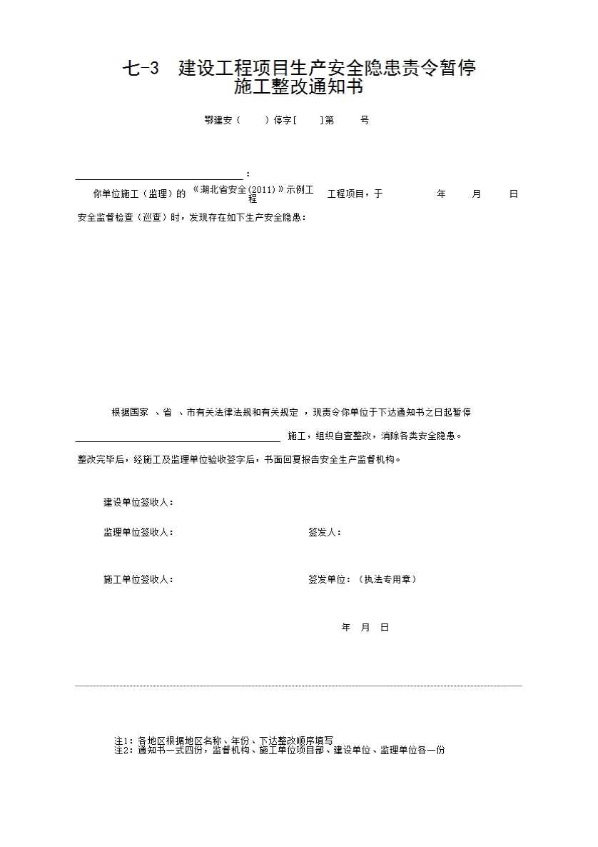 表格名称:七-3 建设工程项目生产安全隐患责令暂停施工整改通知书
