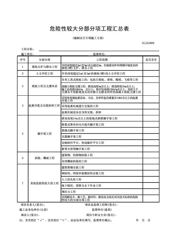 表格名称:XGJA3008 危险性较大分部分项工程汇总表