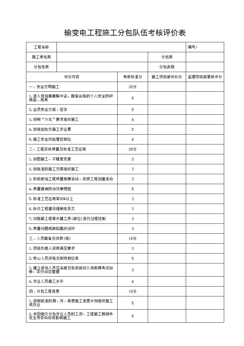 输变电工程施工分包队伍考核评价表
