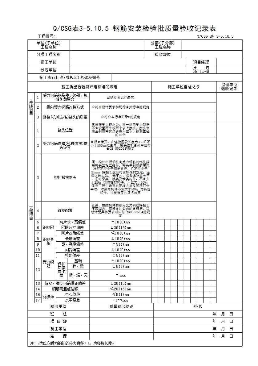 表格名称:QCSG 表 3-10.6.13 钢筋安装检验批质量验收记录表