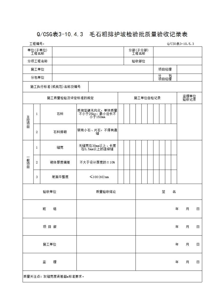 QCSG 表 3-11.4.3 毛石粗排护坡检验批质量验收记录表