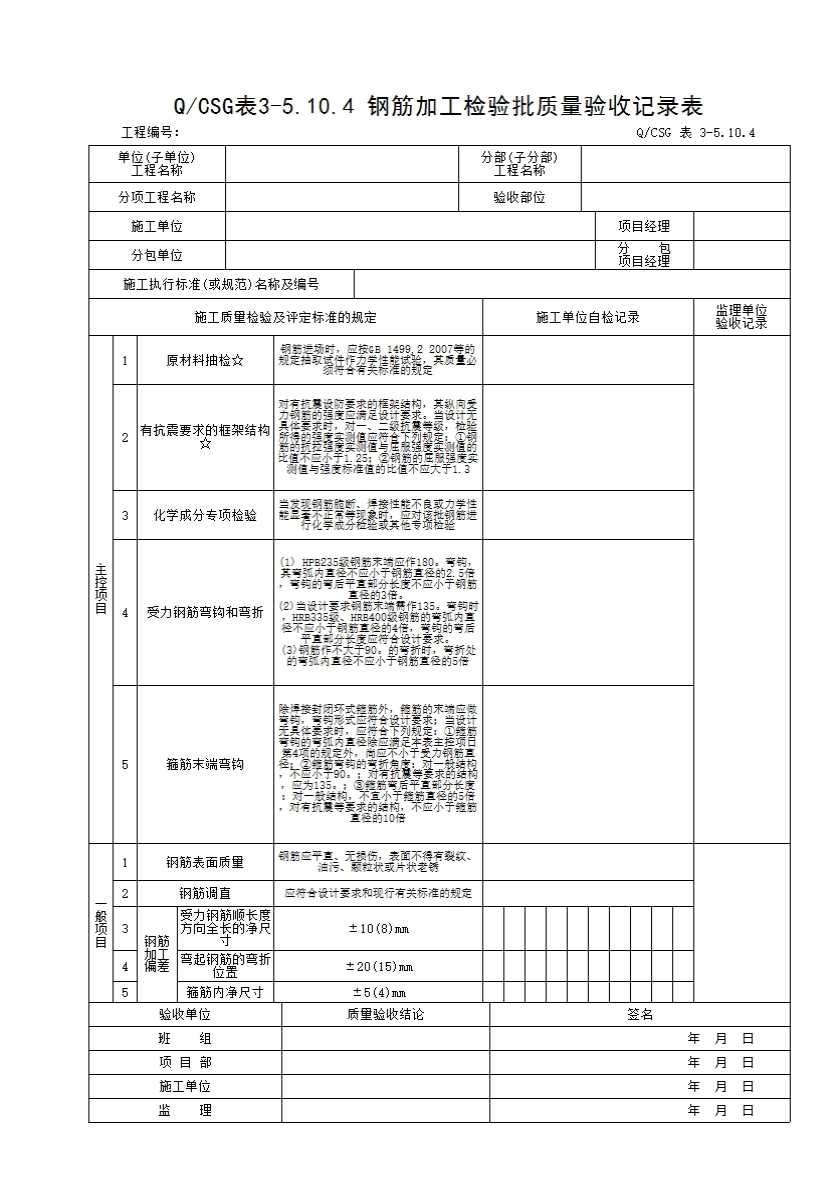 表格名称:QCSG 表 3-11.5.10 钢筋加工检验批质量验收记录表