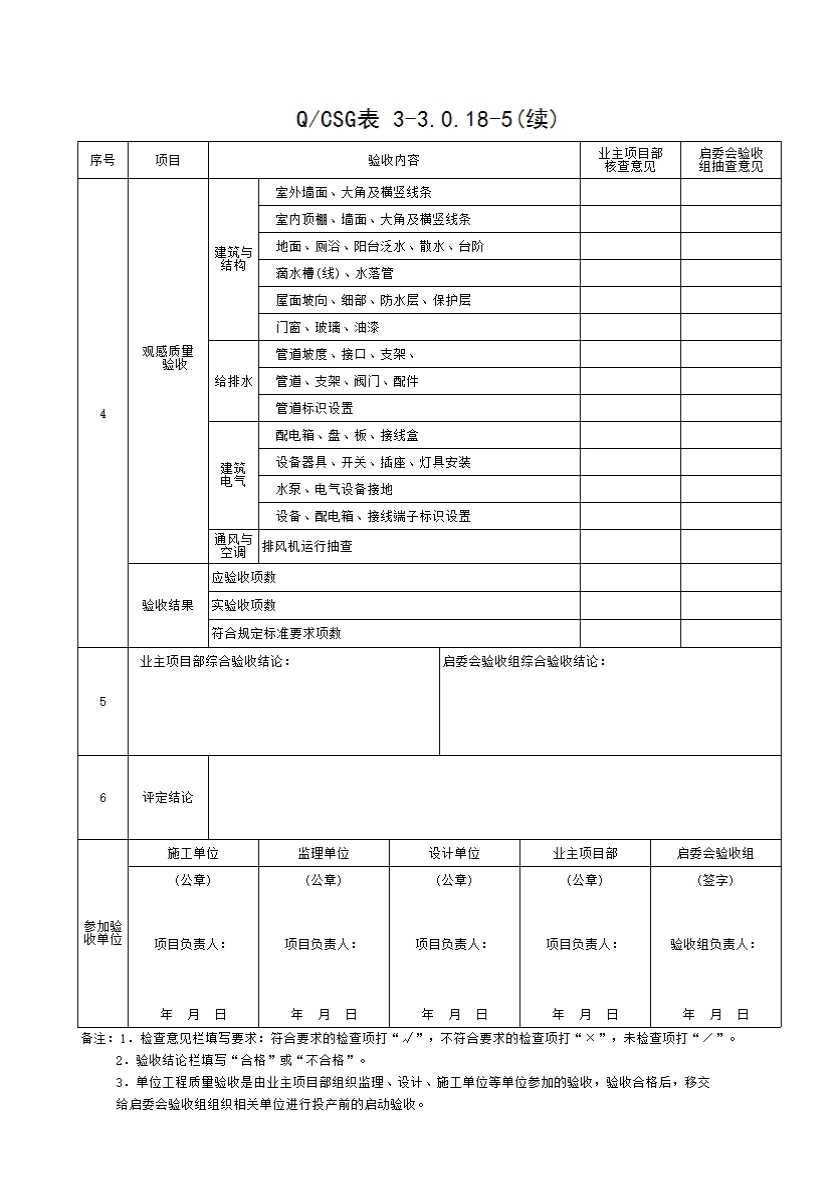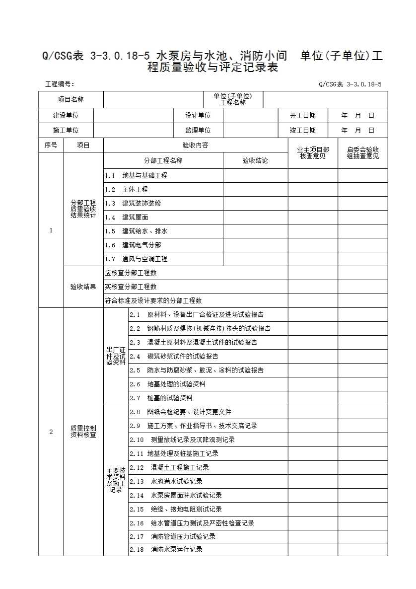 QCSG 表 3-3.0.18-5 水泵房与水池、消防小间 单位(子单位)工程质量验收与评定记录表