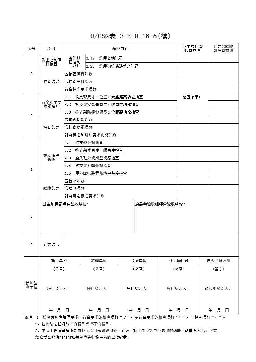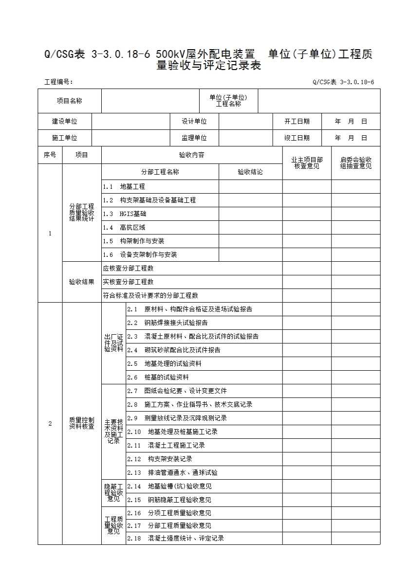 QCSG 表 3-3.0.18-6 500kV屋外配电装置 单位(子单位)工程质量验收与评定记录表
