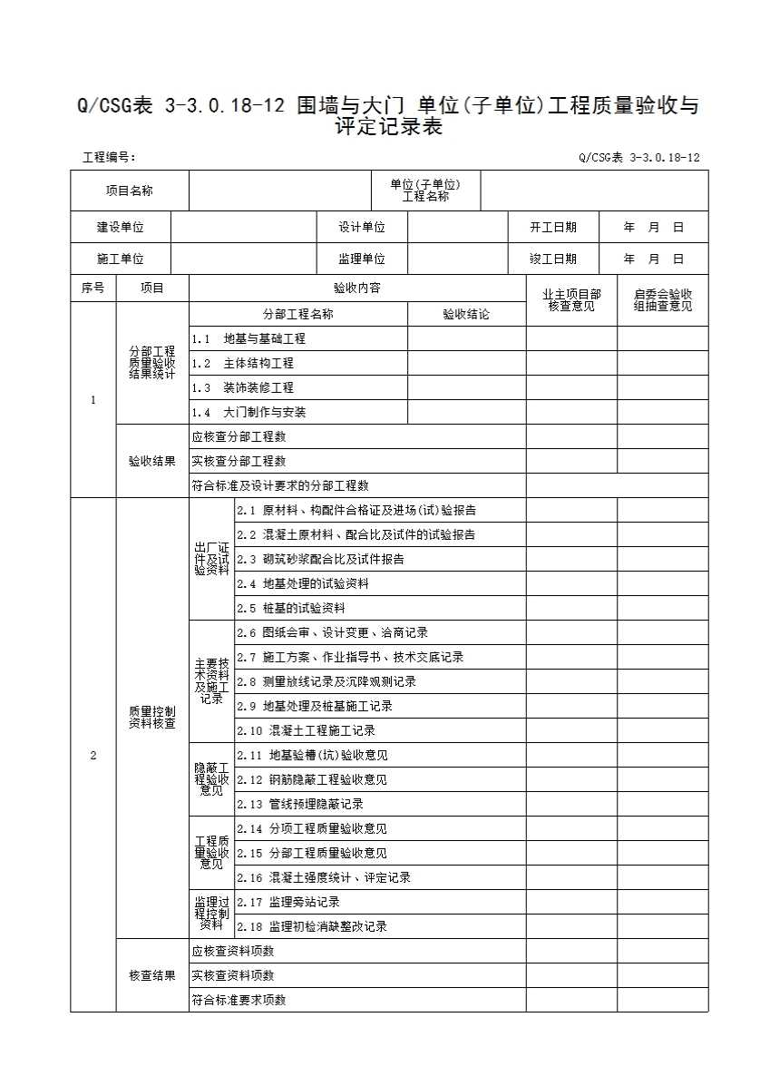 QCSG 表 3-3.0.18-12 围墙与大门 单位(子单位)工程质量验收与评定记录表