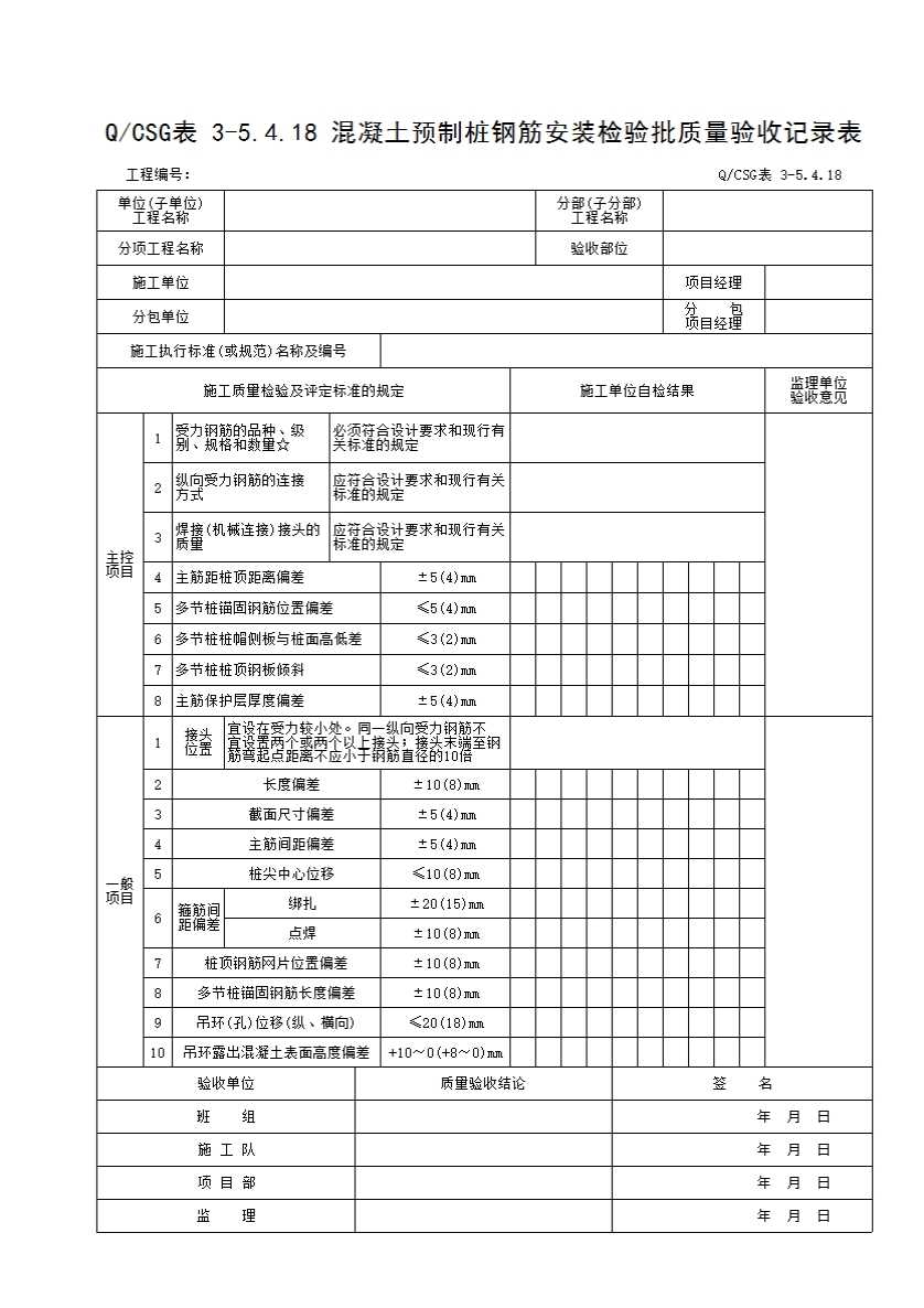 表格名称:QCSG 表 3-5.4.18 混凝土预制桩钢筋安装检验批质量验收记录表