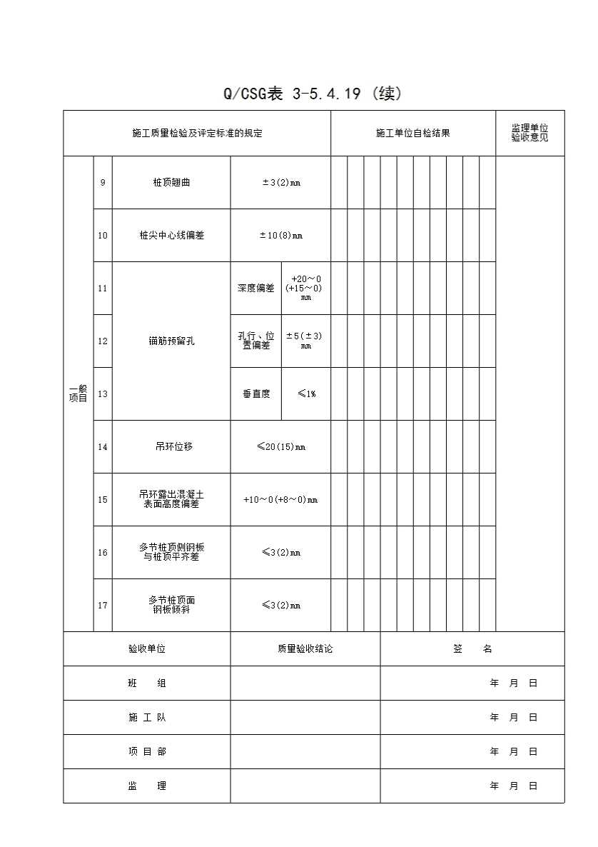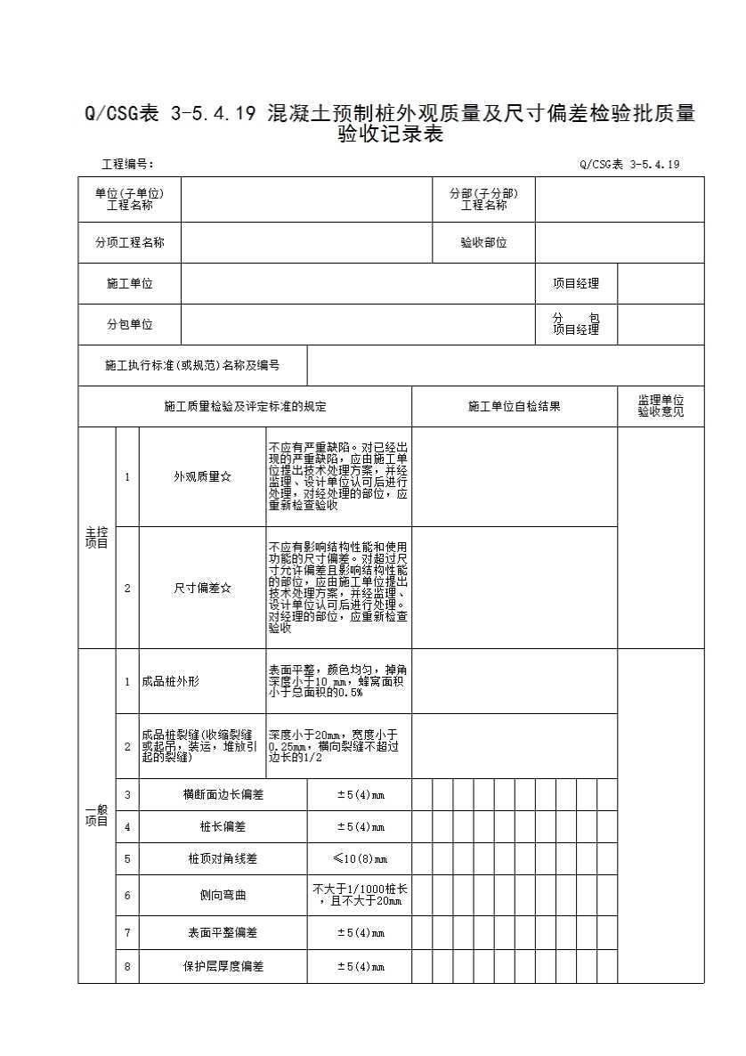 QCSG 表 3-5.4.19 混凝土预制桩外观质量及尺寸偏差检验批质量验收记录表