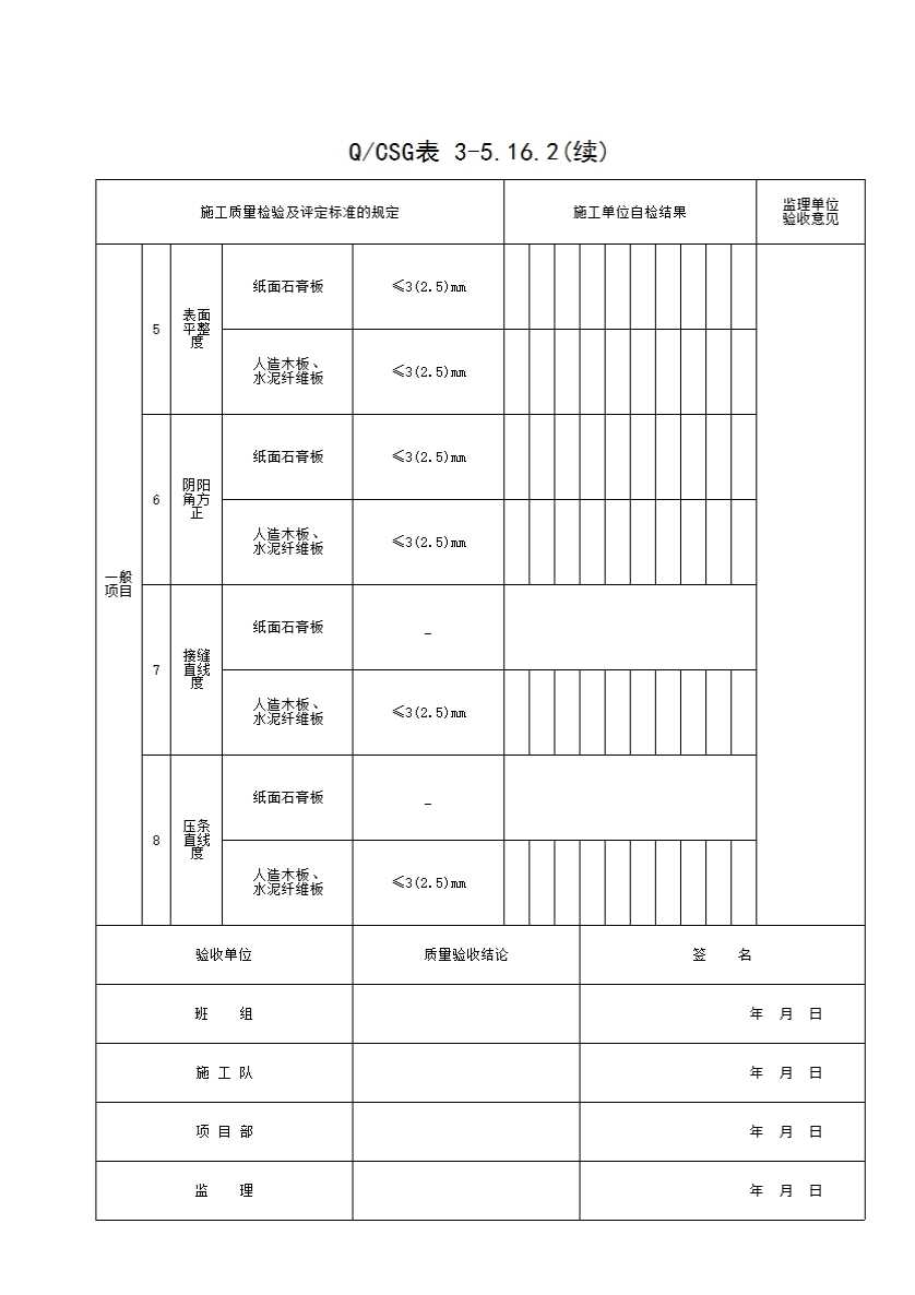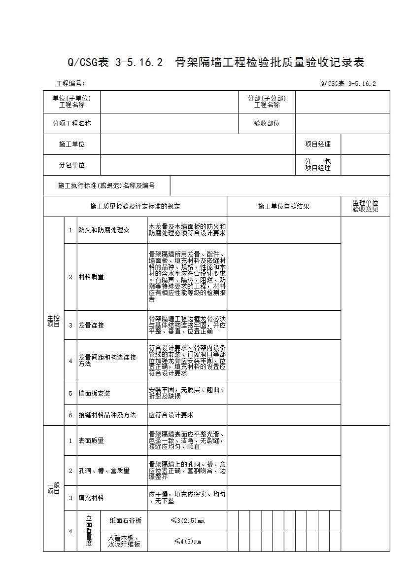 QCSG 表 3-5.16.2 骨架隔墙工程检验批质量验收记录表