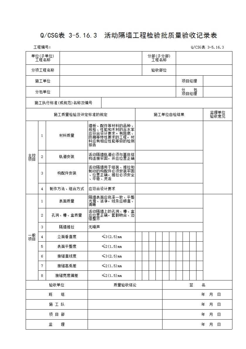 表格名称:QCSG 表 3-5.16.3 活动隔墙工程检验批质量验收记录表